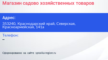 Магазин садово-хозяйственных товаров по адресу 353240, Краснодарский край, Северская, Красноармейская, 141а в дальнейшем Организация, размещена в следующих категориях: