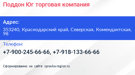 Поддон-Юг, торговая компания по адресу 353240, Краснодарский край, Северская, Комендантская, 98 в дальнейшем Организация, размещена в следующих категориях: