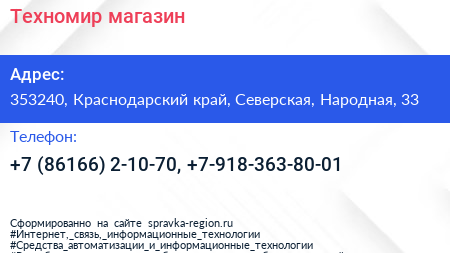Техномир, магазин по адресу 353240, Краснодарский край, Северская, Народная, 33 в дальнейшем Организация, размещена в следующих категориях: