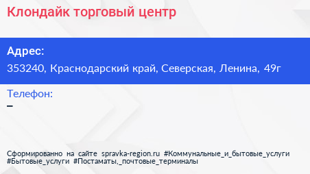 Клондайк, торговый центр по адресу 353240, Краснодарский край, Северская, Ленина, 49г в дальнейшем Организация, размещена в следующих категориях: