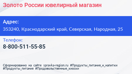 Золото России, ювелирный магазин по адресу 353240, Краснодарский край, Северская, Народная, 25 в дальнейшем Организация, размещена в следующих категориях:
