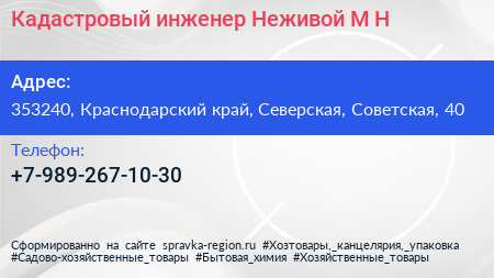 Кадастровый инженер Неживой М.Н. по адресу 353240, Краснодарский край, Северская, Советская, 40 в дальнейшем Организация, размещена в следующих категориях: