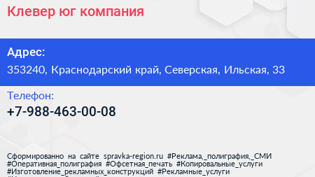 Клевер юг, компания по адресу 353240, Краснодарский край, Северская, Ильская, 33 в дальнейшем Организация, размещена в следующих категориях:
