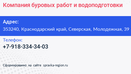 Компания буровых работ и водоподготовки по адресу 353240, Краснодарский край, Северская, Молодежная, 39 в дальнейшем Организация, размещена в следующих категориях: