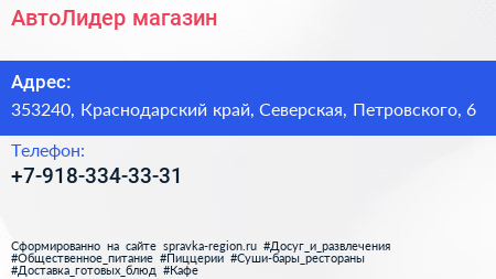 АвтоЛидер, магазин по адресу 353240, Краснодарский край, Северская, Петровского, 6 в дальнейшем Организация, размещена в следующих категориях:
