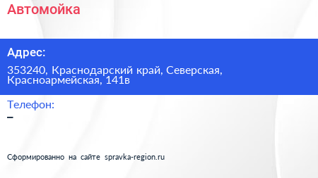Автомойка по адресу 353240, Краснодарский край, Северская, Красноармейская, 141в в дальнейшем Организация, размещена в следующих категориях: