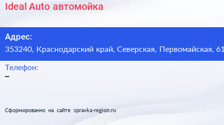 Ideal Auto, автомойка по адресу 353240, Краснодарский край, Северская, Первомайская, 61 в дальнейшем Организация, размещена в следующих категориях: