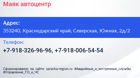 Маяк, автоцентр по адресу 353240, Краснодарский край, Северская, Южная, 2д/2 в дальнейшем Организация, размещена в следующих категориях: