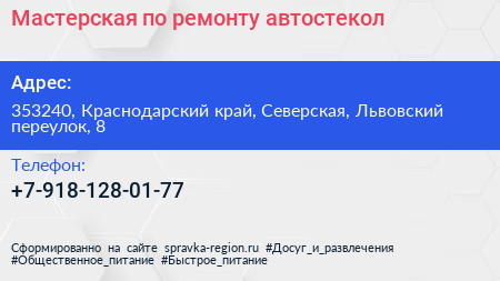 Мастерская по ремонту автостекол по адресу 353240, Краснодарский край, Северская, Львовский переулок, 8 в дальнейшем Организация, размещена в следующих категориях: