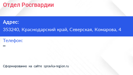 Отдел Росгвардии по адресу 353240, Краснодарский край, Северская, Комарова, 4 в дальнейшем Организация, размещена в следующих категориях: