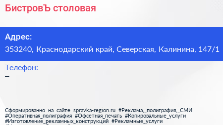 БистровЪ, столовая по адресу 353240, Краснодарский край, Северская, Калинина, 147/1 в дальнейшем Организация, размещена в следующих категориях: