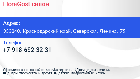 FloraGost, салон по адресу 353240, Краснодарский край, Северская, Ленина, 75 в дальнейшем Организация, размещена в следующих категориях: