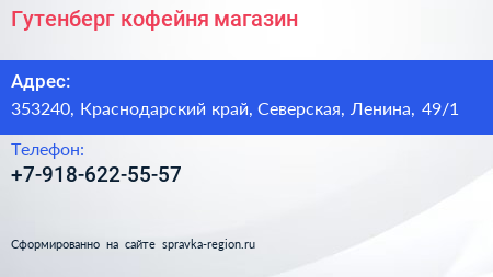 Гутенберг, кофейня-магазин по адресу 353240, Краснодарский край, Северская, Ленина, 49/1 в дальнейшем Организация, размещена в следующих категориях: