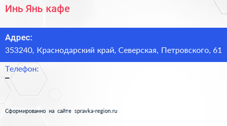 Инь-Янь, кафе по адресу 353240, Краснодарский край, Северская, Петровского, 61 в дальнейшем Организация, размещена в следующих категориях: