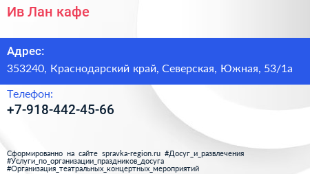 Ив-Лан, кафе по адресу 353240, Краснодарский край, Северская, Южная, 53/1а в дальнейшем Организация, размещена в следующих категориях: