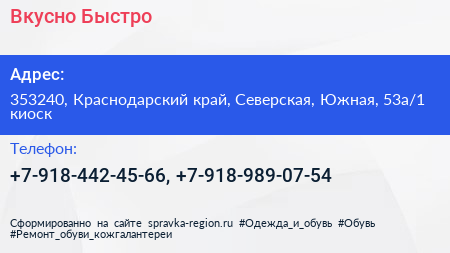 Вкусно Быстро по адресу 353240, Краснодарский край, Северская, Южная, 53а/1 киоск в дальнейшем Организация, размещена в следующих категориях: