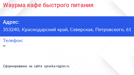 Wаурма, кафе быстрого питания по адресу 353240, Краснодарский край, Северская, Петровского, 61 в дальнейшем Организация, размещена в следующих категориях: