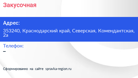 Закусочная по адресу 353240, Краснодарский край, Северская, Комендантская, 2а в дальнейшем Организация, размещена в следующих категориях:
