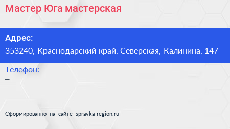 Мастер Юга, мастерская по адресу 353240, Краснодарский край, Северская, Калинина, 147 в дальнейшем Организация, размещена в следующих категориях: