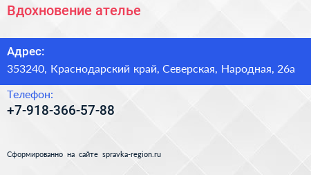 Вдохновение, ателье по адресу 353240, Краснодарский край, Северская, Народная, 26а в дальнейшем Организация, размещена в следующих категориях:
