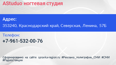 AStuduo, ногтевая студия по адресу 353240, Краснодарский край, Северская, Ленина, 57Б в дальнейшем Организация, размещена в следующих категориях: