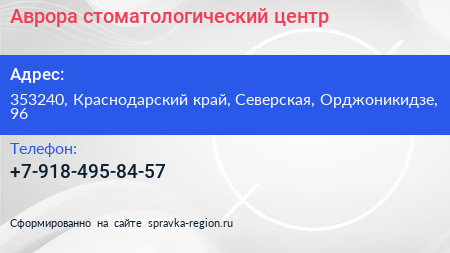 Аврора, стоматологический центр по адресу 353240, Краснодарский край, Северская, Орджоникидзе, 96 в дальнейшем Организация, размещена в следующих категориях: