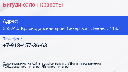 Бигуди, салон красоты по адресу 353240, Краснодарский край, Северская, Ленина, 118а в дальнейшем Организация, размещена в следующих категориях: