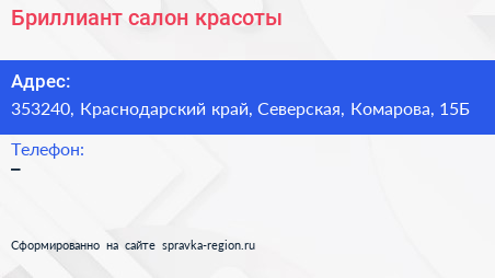 Бриллиант, салон красоты по адресу 353240, Краснодарский край, Северская, Комарова, 15Б в дальнейшем Организация, размещена в следующих категориях: