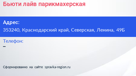 Бьюти лайв, парикмахерская по адресу 353240, Краснодарский край, Северская, Ленина, 49Б в дальнейшем Организация, размещена в следующих категориях: