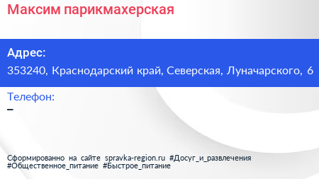 Максим, парикмахерская по адресу 353240, Краснодарский край, Северская, Луначарского, 6 в дальнейшем Организация, размещена в следующих категориях: