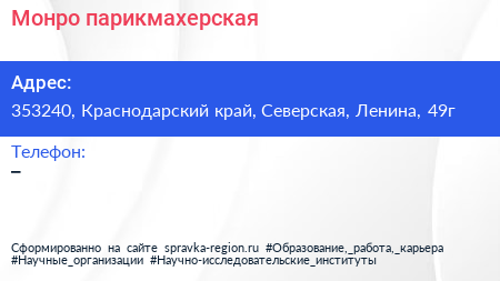 Монро, парикмахерская по адресу 353240, Краснодарский край, Северская, Ленина, 49г в дальнейшем Организация, размещена в следующих категориях:
