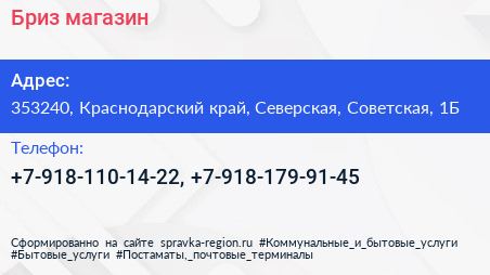 Бриз, магазин по адресу 353240, Краснодарский край, Северская, Советская, 1Б в дальнейшем Организация, размещена в следующих категориях: