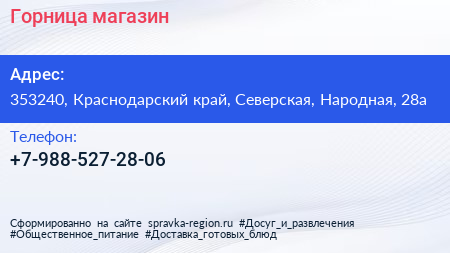 Горница, магазин по адресу 353240, Краснодарский край, Северская, Народная, 28а в дальнейшем Организация, размещена в следующих категориях: