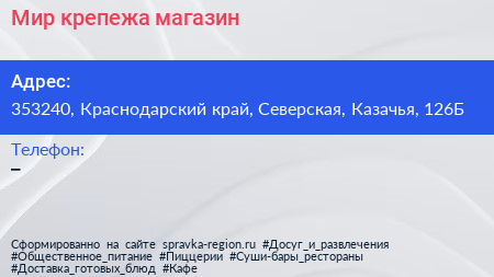Мир крепежа, магазин по адресу 353240, Краснодарский край, Северская, Казачья, 126Б в дальнейшем Организация, размещена в следующих категориях: