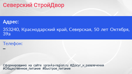 Северский СтройДвор по адресу 353240, Краснодарский край, Северская, 50 лет Октября, 39а в дальнейшем Организация, размещена в следующих категориях: