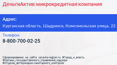 ДеньгиАктив, микрокредитная компания по адресу Курганская область, Шадринск, Комсомольская улица, 22 в дальнейшем Организация, размещена в следующих категориях:
