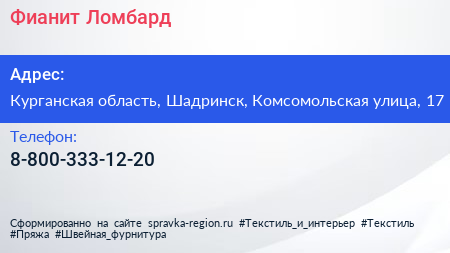 Фианит-Ломбард по адресу Курганская область, Шадринск, Комсомольская улица, 17 в дальнейшем Организация, размещена в следующих категориях: