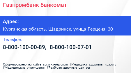 Газпромбанк, банкомат по адресу Курганская область, Шадринск, улица Герцена, 30 в дальнейшем Организация, размещена в следующих категориях: