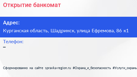 Открытие, банкомат по адресу Курганская область, Шадринск, улица Ефремова, 86 к1 в дальнейшем Организация, размещена в следующих категориях: