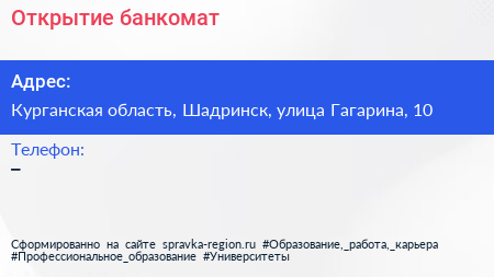 Открытие, банкомат по адресу Курганская область, Шадринск, улица Гагарина, 10 в дальнейшем Организация, размещена в следующих категориях: