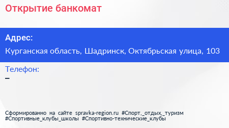 Открытие, банкомат по адресу Курганская область, Шадринск, Октябрьская улица, 103 в дальнейшем Организация, размещена в следующих категориях: