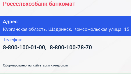 Россельхозбанк, банкомат по адресу Курганская область, Шадринск, Комсомольская улица, 15 в дальнейшем Организация, размещена в следующих категориях: