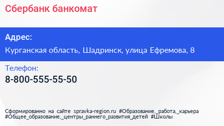 Сбербанк, банкомат по адресу Курганская область, Шадринск, улица Ефремова, 8 в дальнейшем Организация, размещена в следующих категориях: