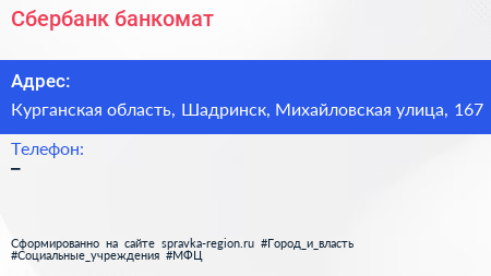 Сбербанк, банкомат по адресу Курганская область, Шадринск, Михайловская улица, 167 в дальнейшем Организация, размещена в следующих категориях: