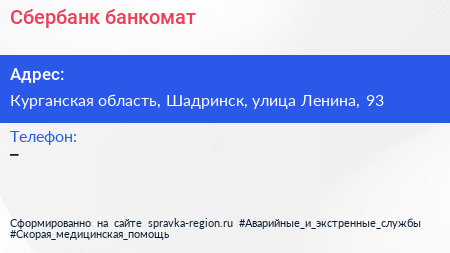 Сбербанк, банкомат по адресу Курганская область, Шадринск, улица Ленина, 93 в дальнейшем Организация, размещена в следующих категориях: