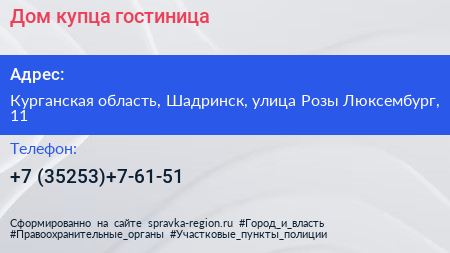 Дом купца, гостиница по адресу Курганская область, Шадринск, улица Розы Люксембург, 11 в дальнейшем Организация, размещена в следующих категориях: