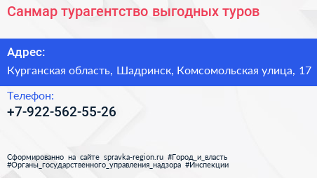 Санмар, турагентство выгодных туров по адресу Курганская область, Шадринск, Комсомольская улица, 17 в дальнейшем Организация, размещена в следующих категориях: