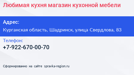 Любимая кухня, магазин кухонной мебели по адресу Курганская область, Шадринск, улица Свердлова, 83 в дальнейшем Организация, размещена в следующих категориях: