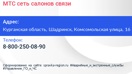 МТС, сеть салонов связи по адресу Курганская область, Шадринск, Комсомольская улица, 16 в дальнейшем Организация, размещена в следующих категориях: