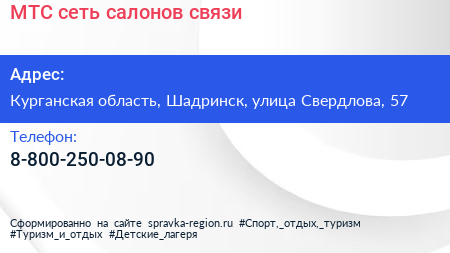 МТС, сеть салонов связи по адресу Курганская область, Шадринск, улица Свердлова, 57 в дальнейшем Организация, размещена в следующих категориях: